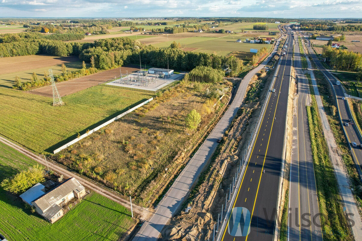 Dłuższym bokiem sąsiaduje z drogą serwisową budowanego obecnie odcinka S7.