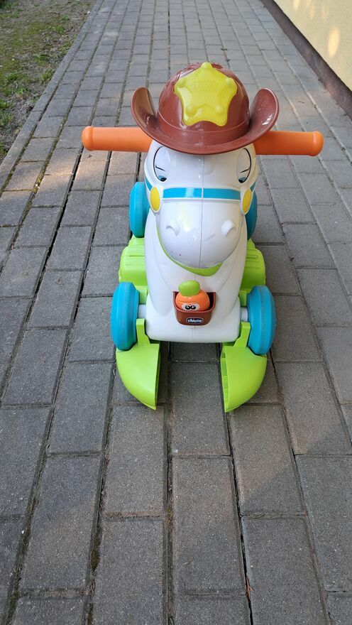 Interaktywny konik na biegunach+panel swiecaco muzyczny; rusza oczami; wydaje dzwieki; gra; zdejmowane płozy.Klaudia